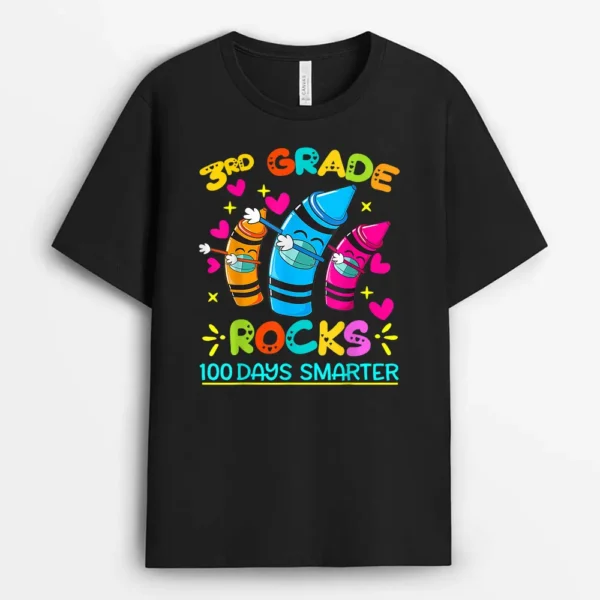 100 Days Smarter 3rd Grade Crayon – 3rd Grade Rocks Teacher T-Shirt – Black