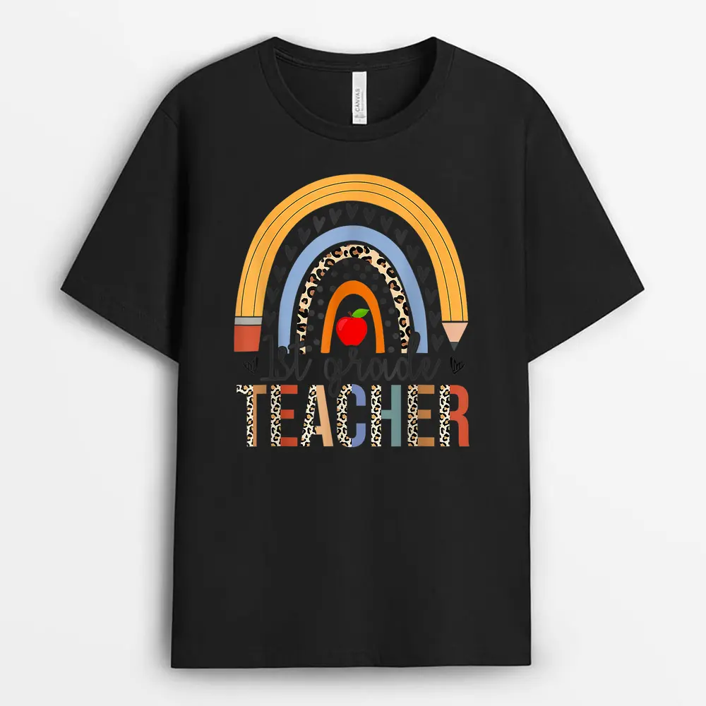 1st Grade Teacher Leopards Rainbow First Day Of School Funny T-Shirt – Black