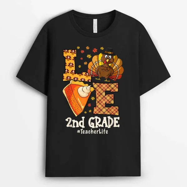 2022 Thanksgiving Love 2nd Grade Teacher Turkey Autumn Fall T-Shirt – Black