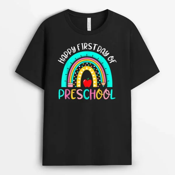 Back To School Rainbow Happy First Day Of Preschool Teacher T-Shirt – Black