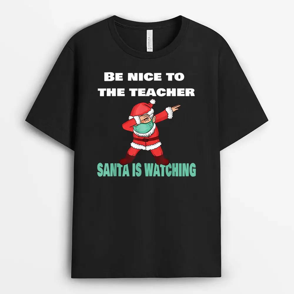 Be Nice To The Teacher Santa Is Watching Christmas Dabbing T-Shirt – Black