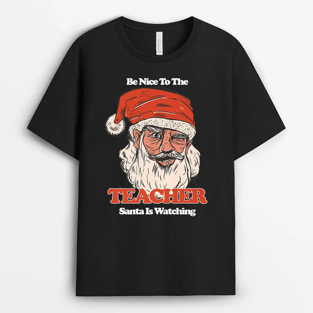 Be Nice To The Teacher Santa Is Watching Christmas Ver 4 T-Shirt – Black