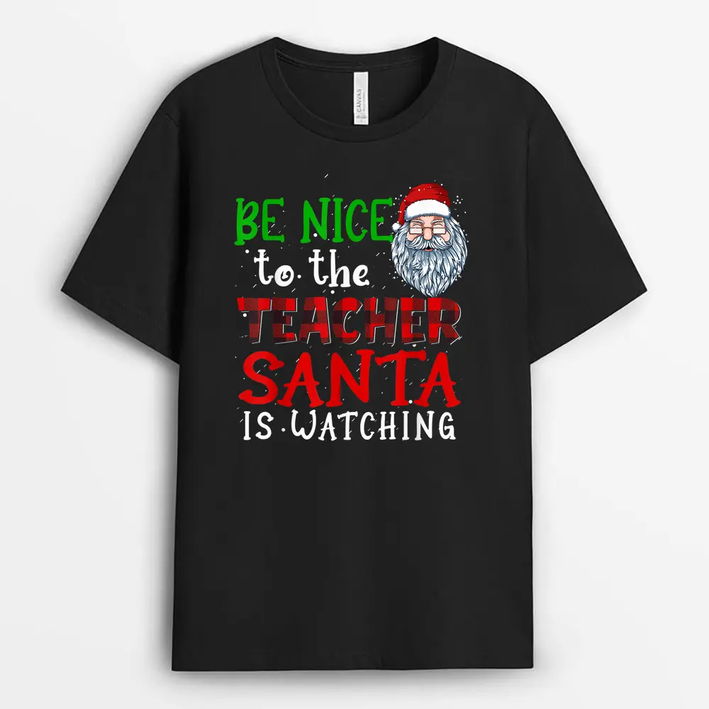 Be Nice To The Teacher Santa Is Watching Christmas Ver 5 T-Shirt – Black