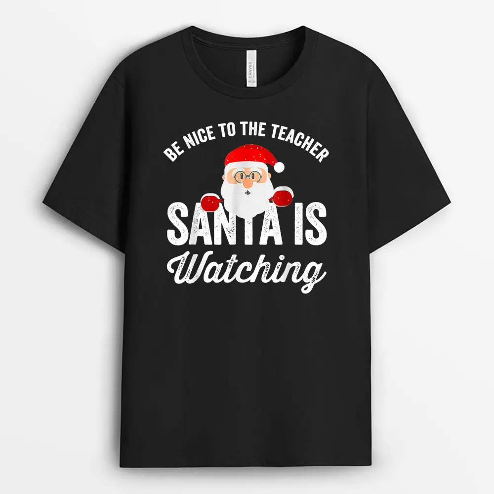 Be Nice To The Teacher Santa Is Watching Funny Christmas Ver 2 T-Shirt – Black