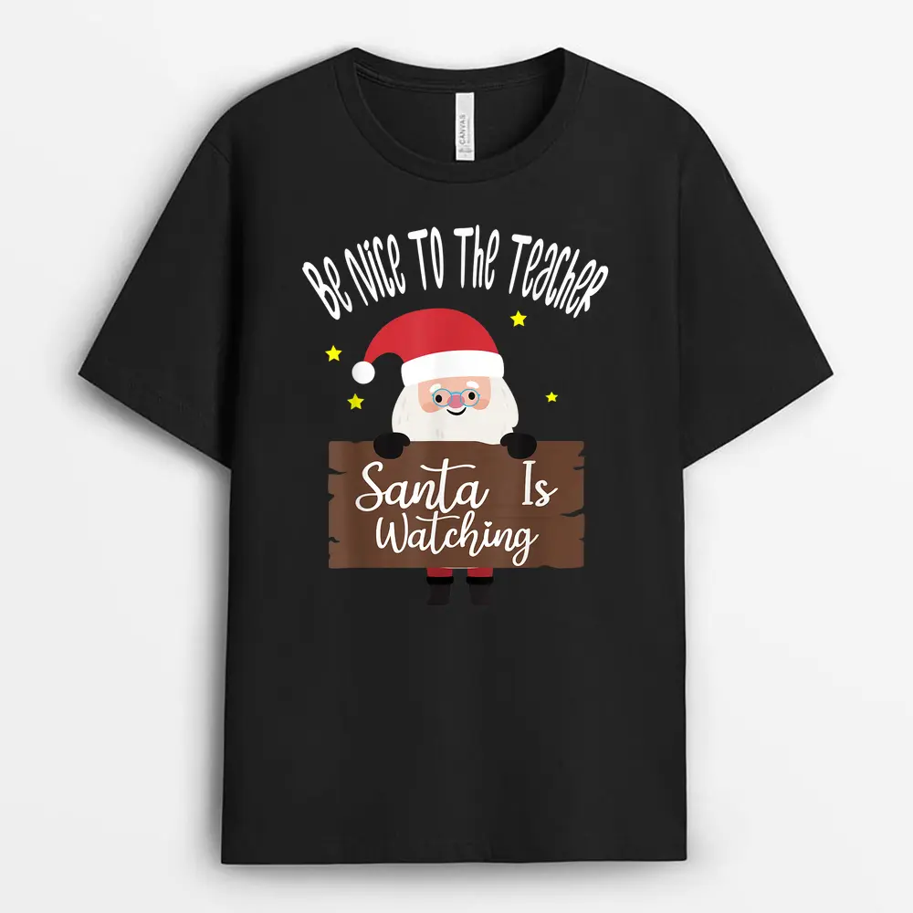 Be Nice To The Teacher Santa Is Watching Santa In Christmas T-Shirt – Black