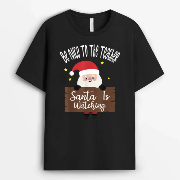 Be Nice To The Teacher Santa Is Watching Santa In Christmas T-Shirt – Black