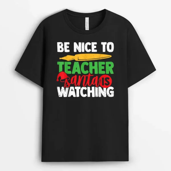 Be Nice To The Teacher Santa Is Watching Teacher Christmas Ver 2 T-Shirt – Black